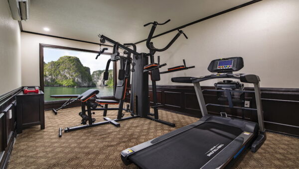Key facilities include a mini swimming pool/jacuzzi, fitness center/gym, spa & massage (extra fee), fine-dining restaurant serving traditional Vietnamese seafood, vegetarian, and customizable meals, plus onboard activities like Tai Chi, cooking class, squid fishing, and more.