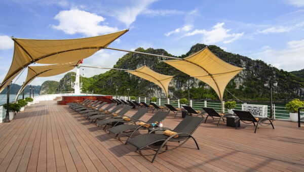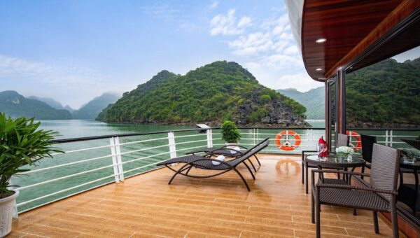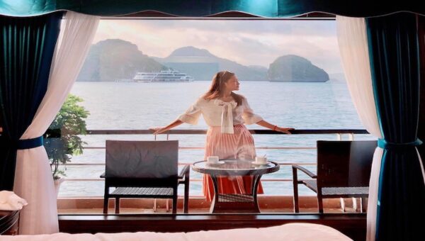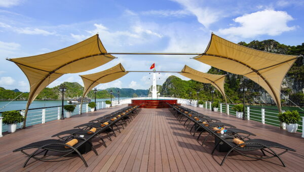 Here are stunning views of the ship’s elegant modern exterior sailing through the emerald waters of Lan Ha Bay: