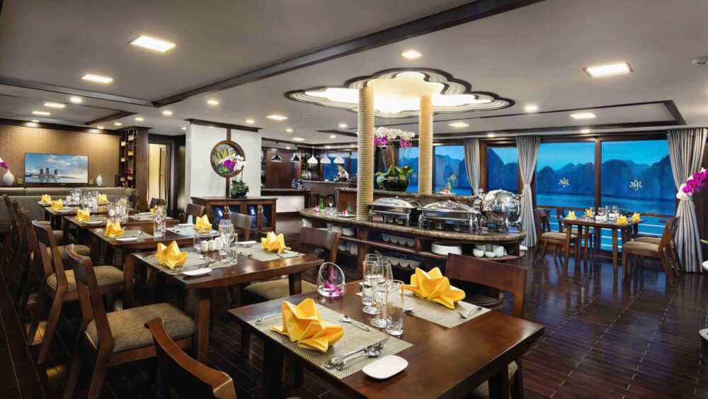 • 12:45 – 13:00: Delight in a delicious lunch served in the restaurant while cruising through the magnificent Ha Long Bay and into the less-crowded Lan Ha Bay – part of the New Seven Wonders of Nature.